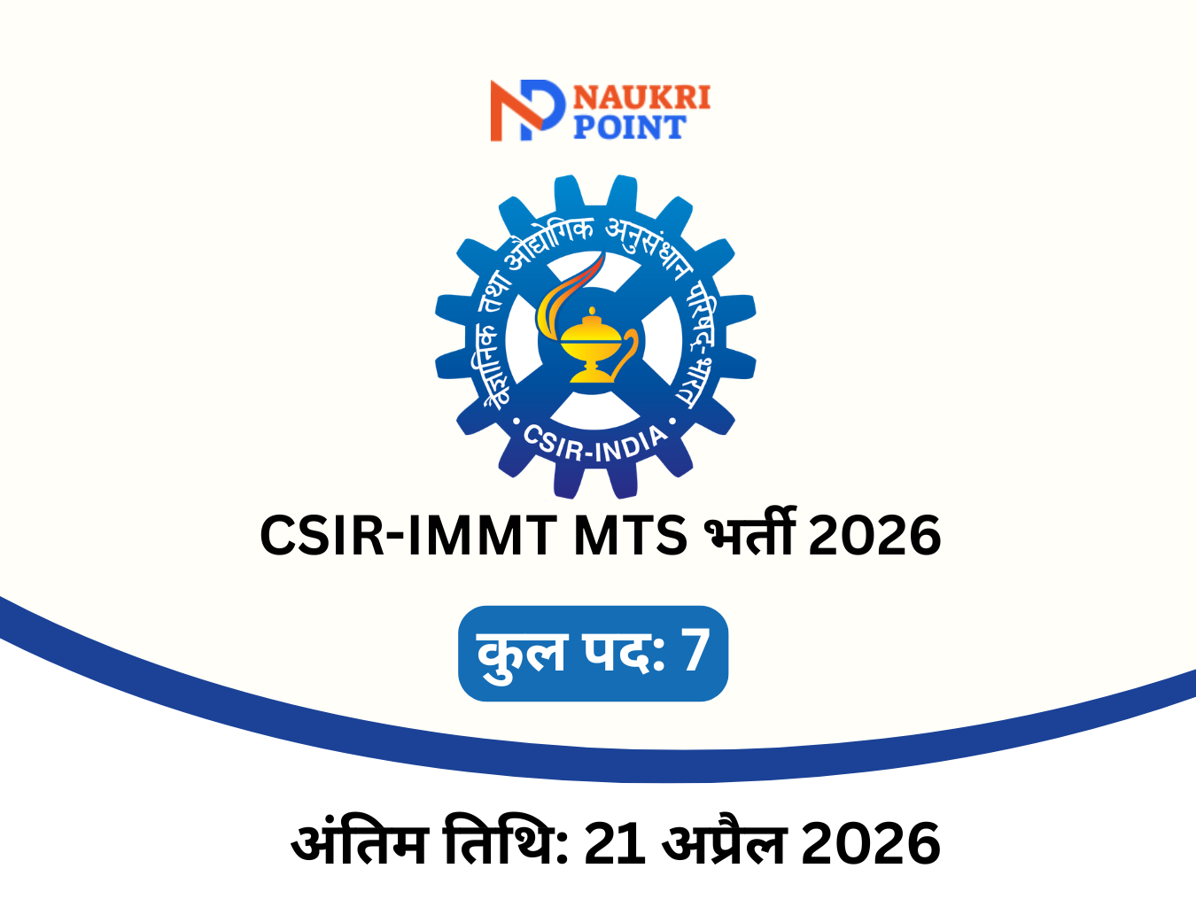 CSIR-इंस्टीट्यूट ऑफ मिनरल्स एंड मटेरियल्स टेक्नोलॉजी (CSIR-IMMT), भुवनेश्वर ने Multi-Tasking Staff (MTS) के 7 पदों पर भर्ती का आधिकारिक नोटिफिकेशन जारी कर दिया है। यह पे लेवल-1 (₹18,000 – ₹56,900) के तहत सेंट्रल गवर्नमेंट जॉब है।