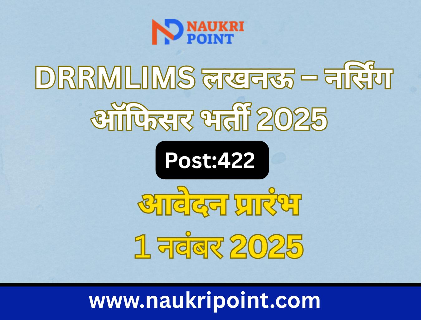 डॉ. राम मनोहर लोहिया इंस्टीट्यूट ऑफ मेडिकल साइंसेस (DRRMLIMS), लखनऊ ने नर्सिंग ऑफिसर (ग्रुप-‘B’) के 422 पदों पर भर्ती की घोषणा की है।