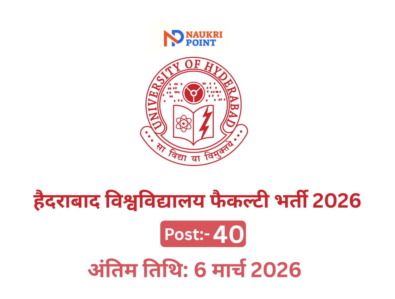 हैदराबाद विश्वविद्यालय (UoH) – Institution of Eminence द्वारा विशेष भर्ती ड्राइव (फेज VI) के तहत प्रोफेसर, एसोसिएट प्रोफेसर एवं असिस्टेंट प्रोफेसर के 40 बैकलॉग आरक्षित पदों पर भर्ती की आधिकारिक अधिसूचना (विज्ञापन संख्या UH/Rectt./Teaching/2026-01) जारी कर दी गई है।
