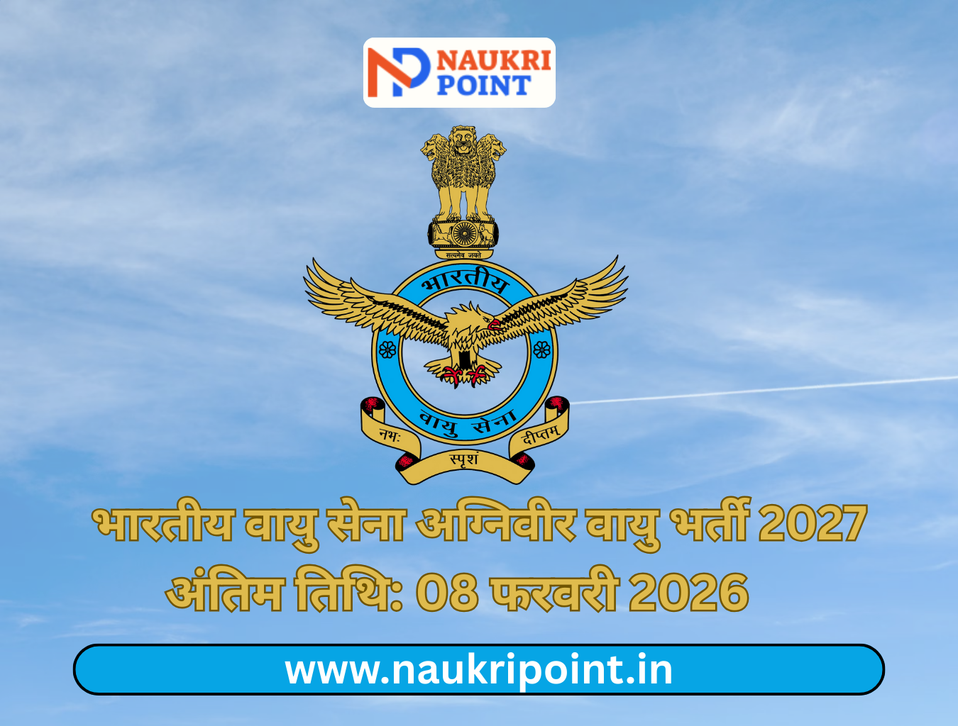 भारतीय वायु सेना (IAF) ने Agniveer Vayu Intake 01/2027 के लिए आधिकारिक अधिसूचना जारी कर दी है। यह अग्निपथ योजना के तहत अविवाहित भारतीय पुरुष एवं महिला उम्मीदवारों के लिए नीली वर्दी पहनकर राष्ट्र सेवा करने का शानदार अवसर है।