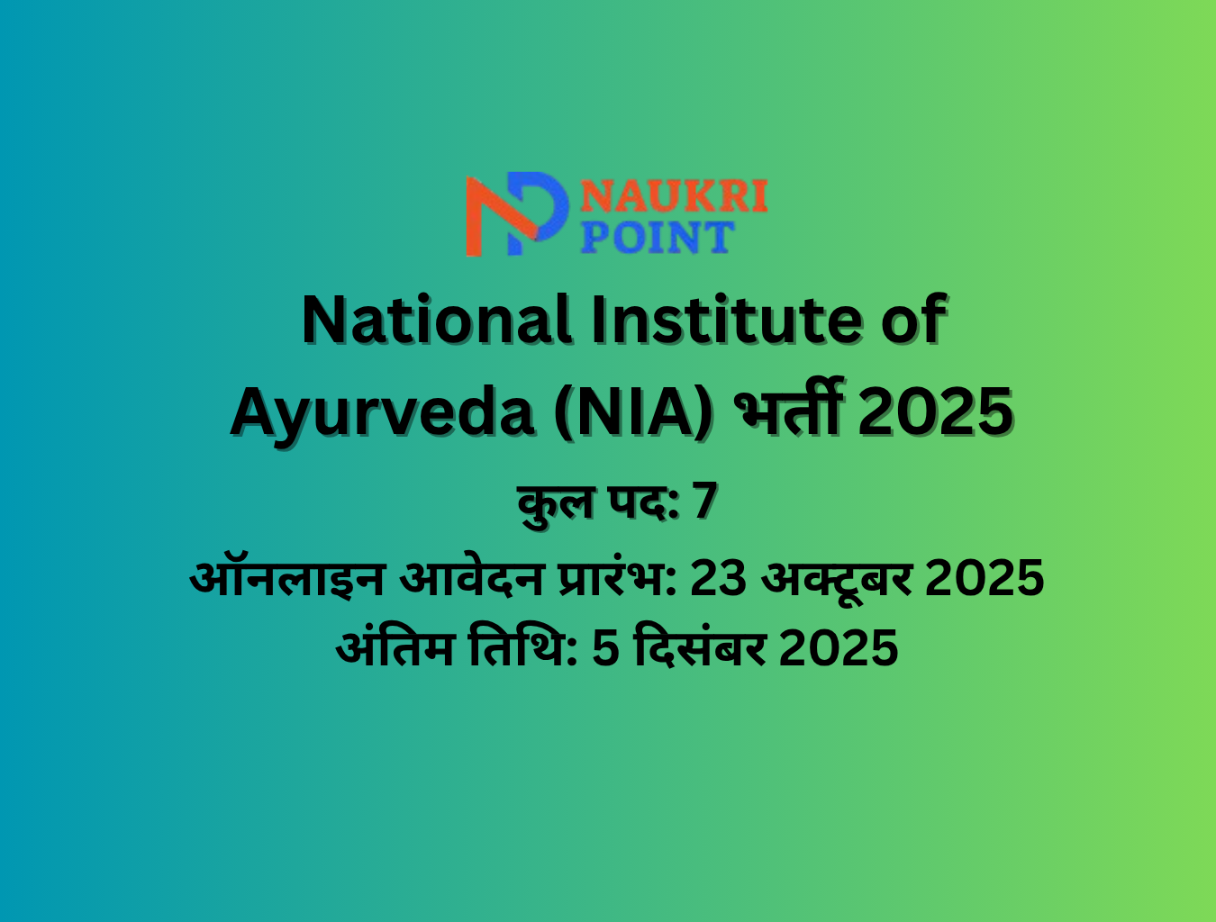 राष्ट्रीय आयुर्वेद संस्थान (NIA) जयपुर में विभिन्न पदों के लिए भर्ती 2025 जारी है, जिसमें प्रोफेसर, सहायक प्रोफेसर, प्रशासनिक अधिकारी, रेडियोलॉजिस्ट और मल्टी-टास्किंग स्टाफ (MTS) जैसे पद शामिल हैं। ऑनलाइन आवेदन की अंतिम तिथि 5 दिसंबर 2025 है।