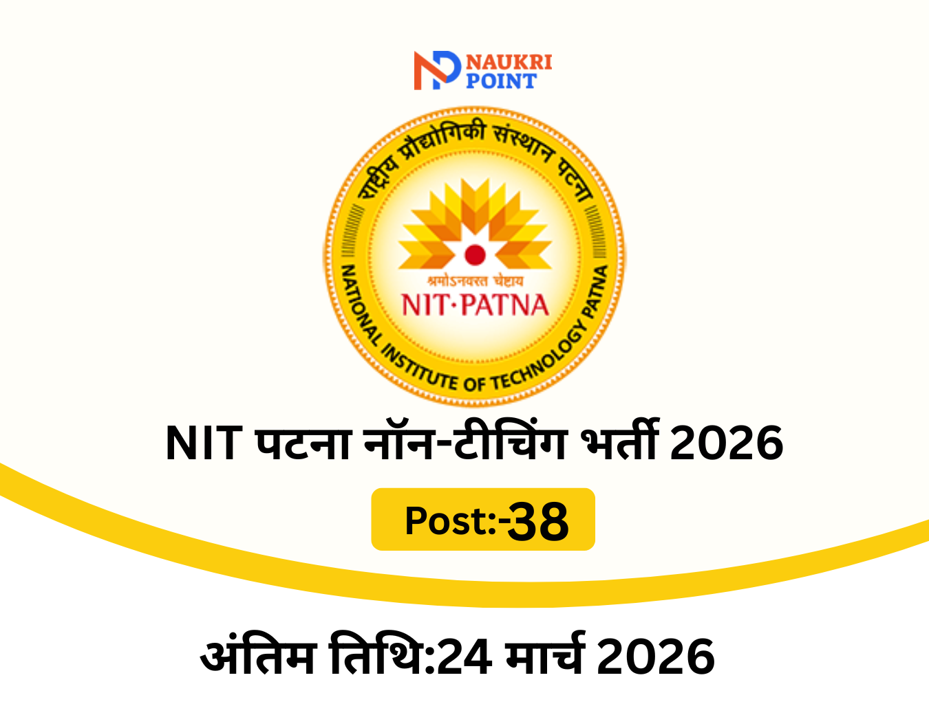 नेशनल इंस्टीट्यूट ऑफ टेक्नोलॉजी (NIT) पटना – शिक्षा मंत्रालय के अधीन राष्ट्रीय महत्व का संस्थान ने 38 नॉन-टीचिंग पदों (ग्रुप A, B और C) पर नियमित भर्ती की आधिकारिक अधिसूचना जारी कर दी है। यह असिस्टेंट रजिस्ट्रार, असिस्टेंट लाइब्रेरियन, सुपरिंटेंडेंट, टेक्निकल असिस्टेंट, जूनियर असिस्टेंट और टेक्नीशियन जैसे पदों के लिए है।