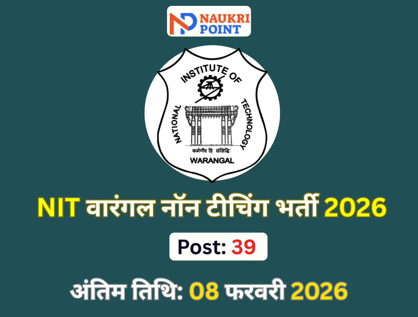 यदि आप किसी प्रतिष्ठित केंद्रीय संस्थान में स्थायी सरकारी नौकरी की तलाश में हैं, तो एनआईटी वारंगल नॉन टीचिंग भर्ती 2026 आपके लिए एक शानदार अवसर है। राष्ट्रीय प्रौद्योगिकी संस्थान (एनआईटी), वारंगल ने विज्ञापन संख्या 01/2026 के अंतर्गत कुल 39 नॉन-टीचिंग पदों पर भर्ती के लिए आधिकारिक अधिसूचना जारी की है।