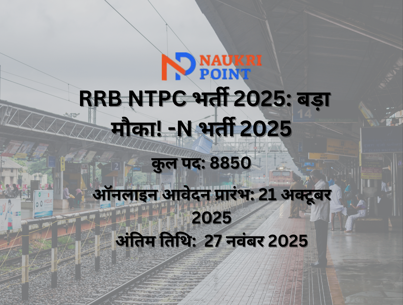 रेलवे भर्ती बोर्ड (RRB) ने नॉन-टेक्निकल पॉपुलर कैटेगरी (NTPC) के अंतर्गत स्टेशन मास्टर, ट्रेन मैनेजर, टिकट क्लर्क, मेट्रो रेलवे असिस्टेंट आदि पदों के लिए 8850 रिक्तियों की आधिकारिक अधिसूचना जारी की है।