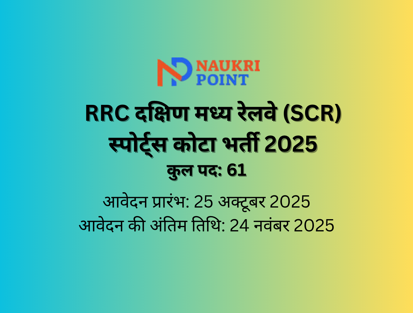 रेलवे भर्ती प्रकोष्ठ (RRC), दक्षिण मध्य रेलवे (SCR) ने स्पोर्ट्स कोटा भर्ती 2025 की अधिसूचना जारी की है।