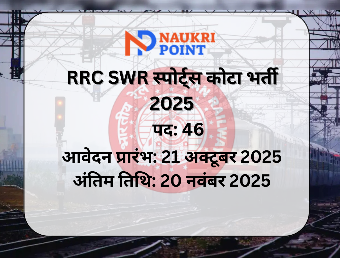 साउथ वेस्टर्न रेलवे (South Western Railway – SWR) ने वर्ष 2025-26 के लिए स्पोर्ट्स कोटा भर्ती की घोषणा की है। यह भर्ती उन प्रतिभाशाली खिलाड़ियों के लिए एक सुनहरा अवसर है जो भारतीय रेलवे जैसी प्रतिष्ठित संस्था में सरकारी नौकरी पाना चाहते हैं और साथ ही अपने खेल करियर को भी आगे बढ़ाना चाहते हैं।