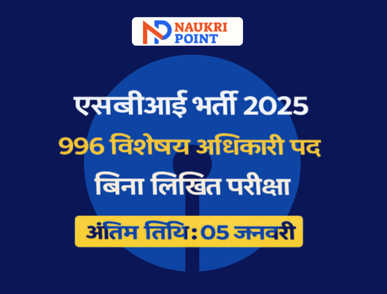 भारतीय स्टेट बैंक (एसबीआई) ने विशेषज्ञ कैडर अधिकारी भर्ती 2025 के अंतर्गत वेल्थ मैनेजमेंट विभाग में 996 पदों पर संविदा आधारित नियुक्ति हेतु अधिसूचना जारी की है।