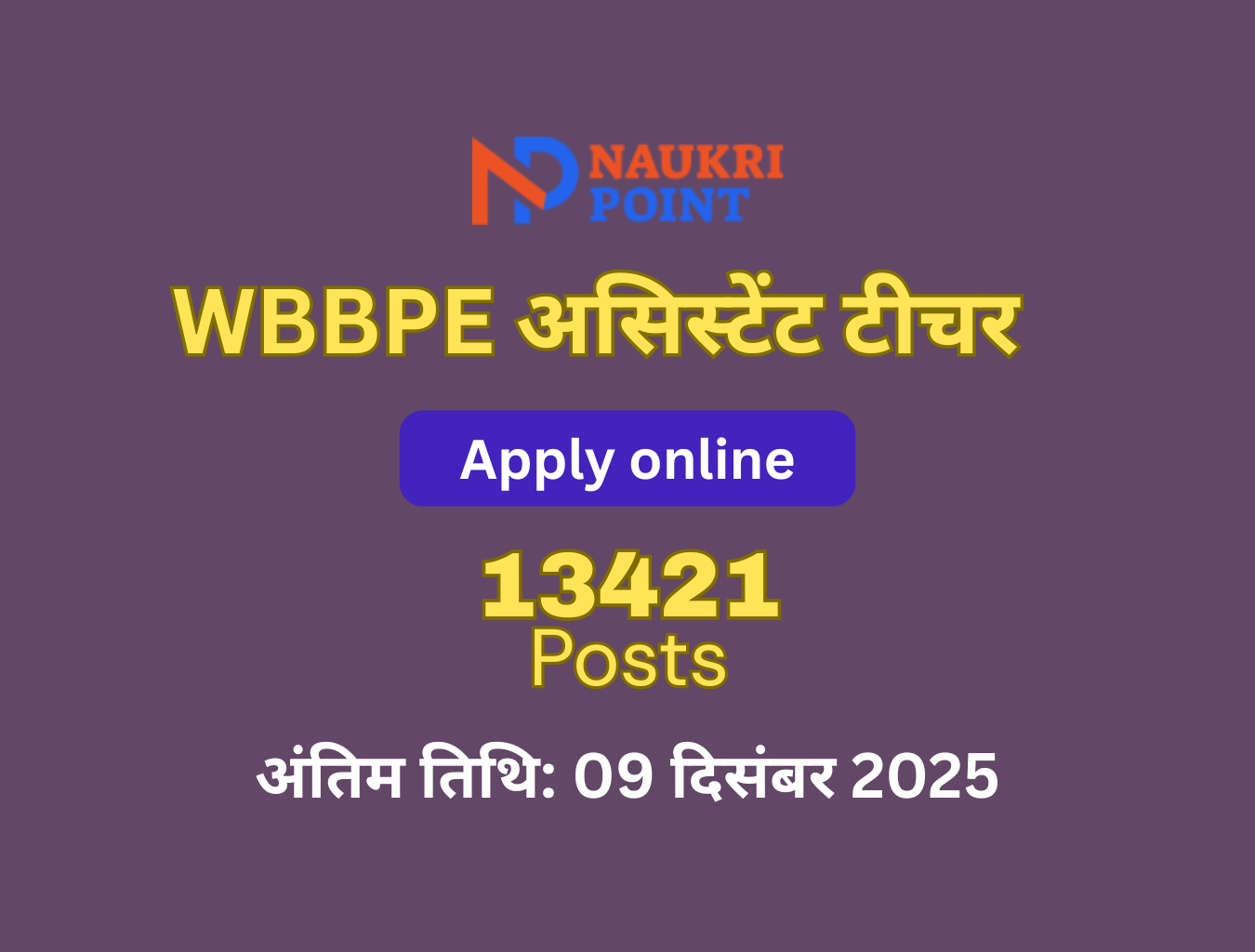 पश्चिम बंगाल प्राथमिक शिक्षा बोर्ड (WBBPE) ने सरकारी सहायता प्राप्त/स्पॉन्सर्ड प्राथमिक और जूनियर बेसिक स्कूलों में असिस्टेंट टीचर पदों पर भर्ती के लिए आधिकारिक अधिसूचना जारी कर दी है। इस वर्ष कुल 13,421 पदों पर भर्ती की जाएगी, जो कि TET पास उम्मीदवारों के लिए एक बड़ा अवसर है।